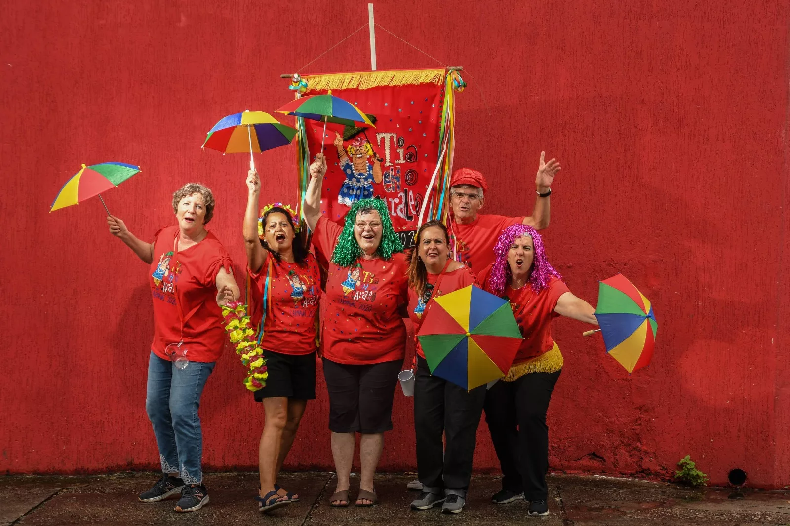 No “Tia Eh o Caraleo”, por exemplo, a proposta aparece na origem do grupo, formado por amigos acima dos 50, e na ideia de incluir uma faixa etária que muitas vezes se sentia fora do foco do Carnaval de rua.