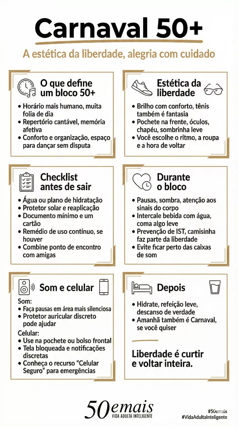Os blocos 50+ mostram uma ideia bonita: maturidade não é recuo, é escolha. A rua continua sendo nossa, desde que a gente a ocupe com inteligência e respeito pelo próprio corpo.