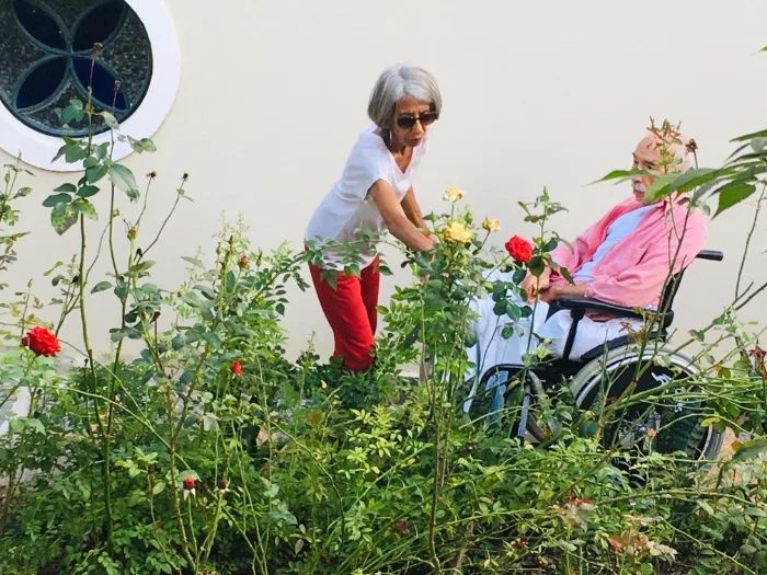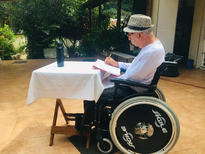 A cuidadora havia acabado de estacionar a cadeira de rodas dele perto da mesa. Pediu que esperasse um pouquinho enquanto ia lá dentro buscar os óculos de leitura.