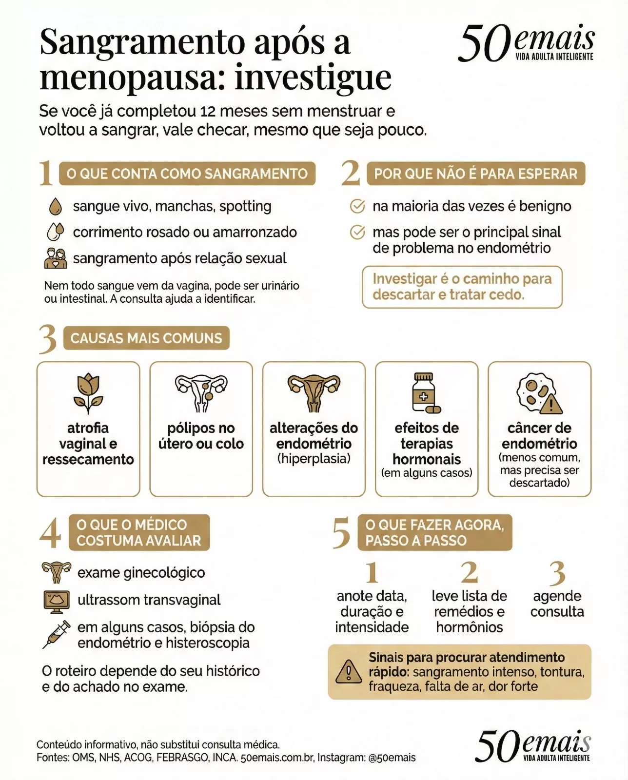 A questão é que o mesmo sintoma também pode ser o sinal mais comum do câncer de endométrio, tumor que se origina no revestimento interno do útero. O Instituto Nacional do CâncerNCA, em material institucional, descreve o sangramento vaginal após a menopausa como o sintoma mais frequente.