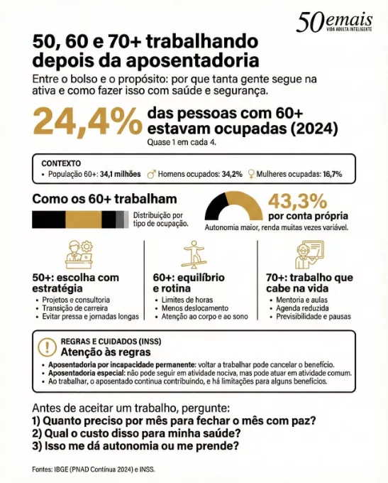Os dados ajudam a colocar o tema em perspectiva. Em 2024, 24,4% das pessoas com 60 anos ou mais estavam ocupadas, segundo o IBGE. E, entre os idosos ocupados, o trabalho por conta própria aparece com força, sinal de uma maturidade mais autônoma e com renda muitas vezes variável.